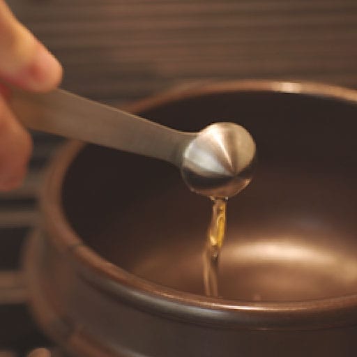 The pot should be nicely warmed up by now. Thinly coat the bottom of the pot with avocado oil and roasted sesame oil. Pour in the egg-broth mixture. Cook on medium-high heat. After about 3 minutes, you should see some small bubbles simmering around the edges. When that happens, turn down the heat to medium-low and cover the pot for another 3 minutes. Turn off the heat, and let the egg sit for another 5 minutes to cool off a bit before serving.
