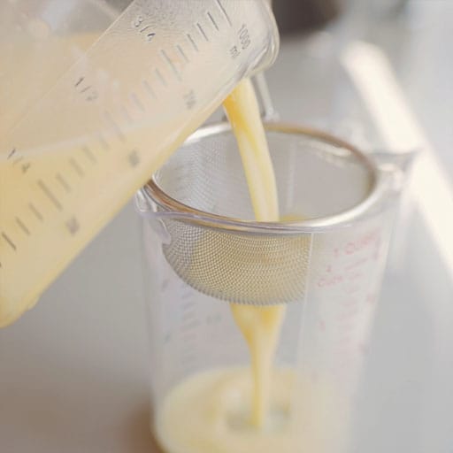 While the pot warms up, whisk together the eggs. Add the bone broth and kosher salt to the eggs. Mix well, then strain to ensure a smooth mixture.